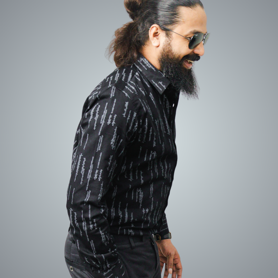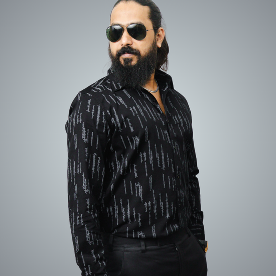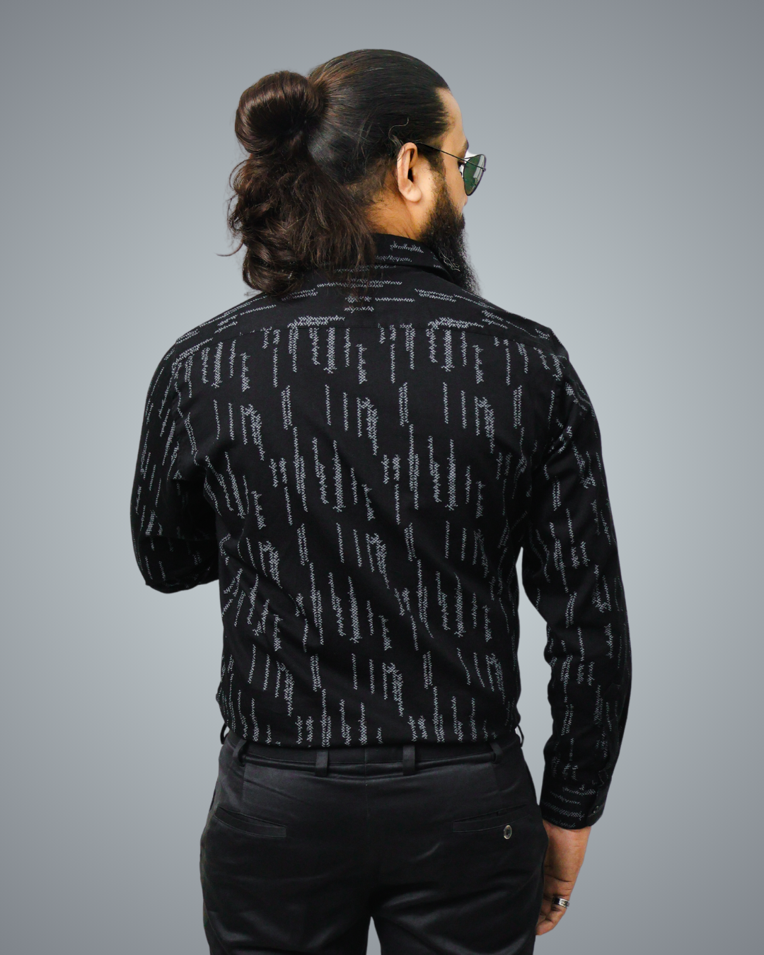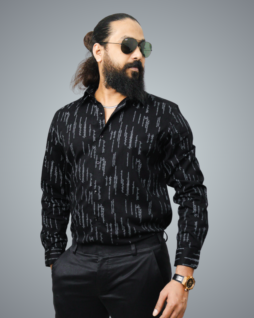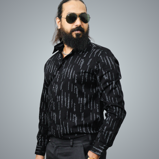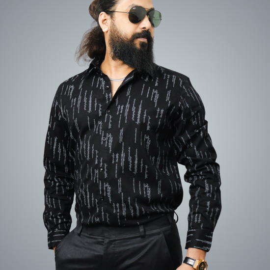 Crafted from 95% cotton and 5% Lycra, this sleek black shirt with bold white prints is a wardrobe essential. Combining comfort and style, it's perfect for casual outings or layering to create a trendy look. Whether you're going for a polished appearance or a relaxed vibe, this shirt is a must-have for any fashion-savvy collection.