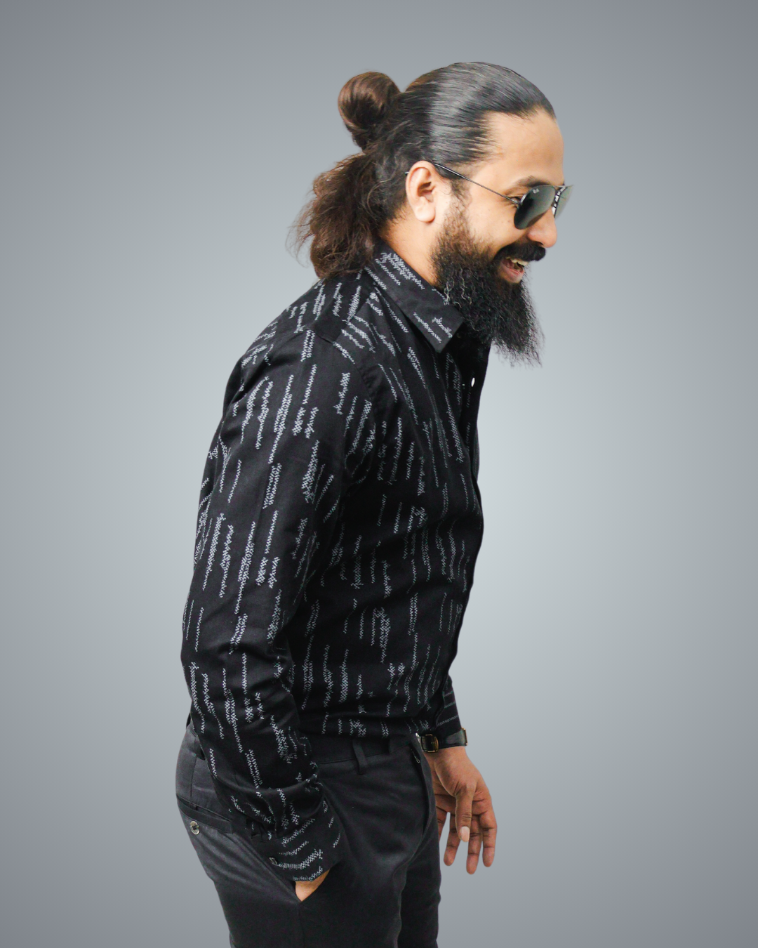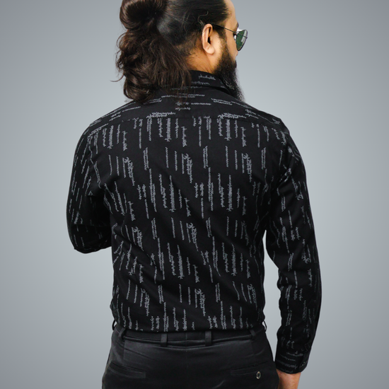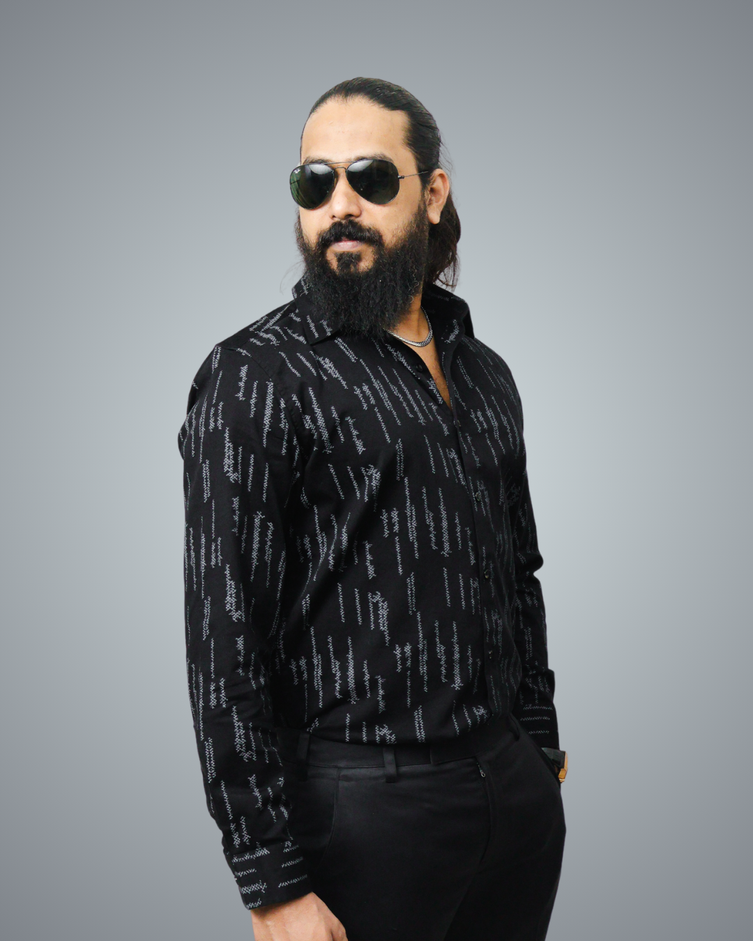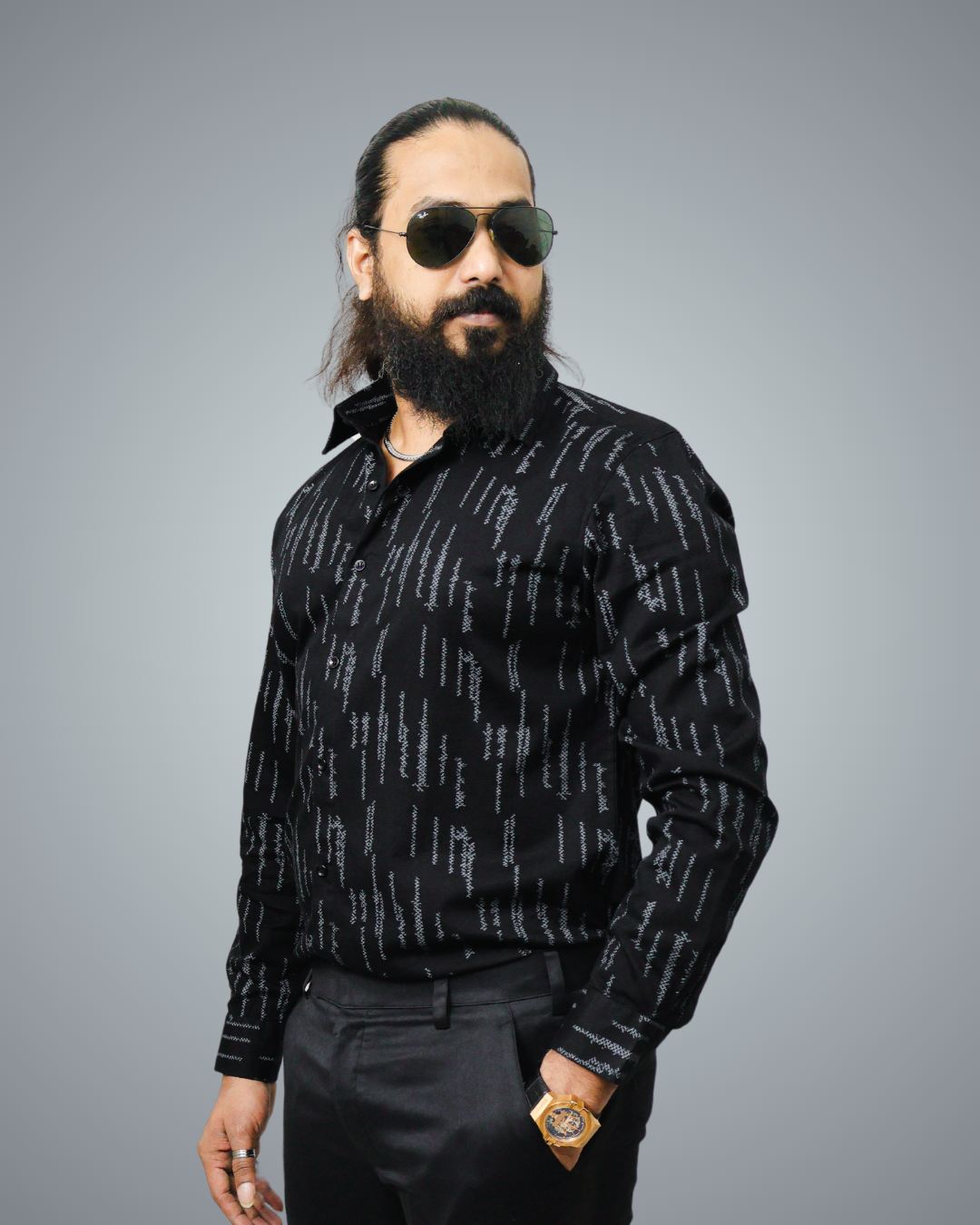Crafted from 95% cotton and 5% Lycra, this sleek black shirt with bold white prints is a wardrobe essential. Combining comfort and style, it's perfect for casual outings or layering to create a trendy look. Whether you're going for a polished appearance or a relaxed vibe, this shirt is a must-have for any fashion-savvy collection.