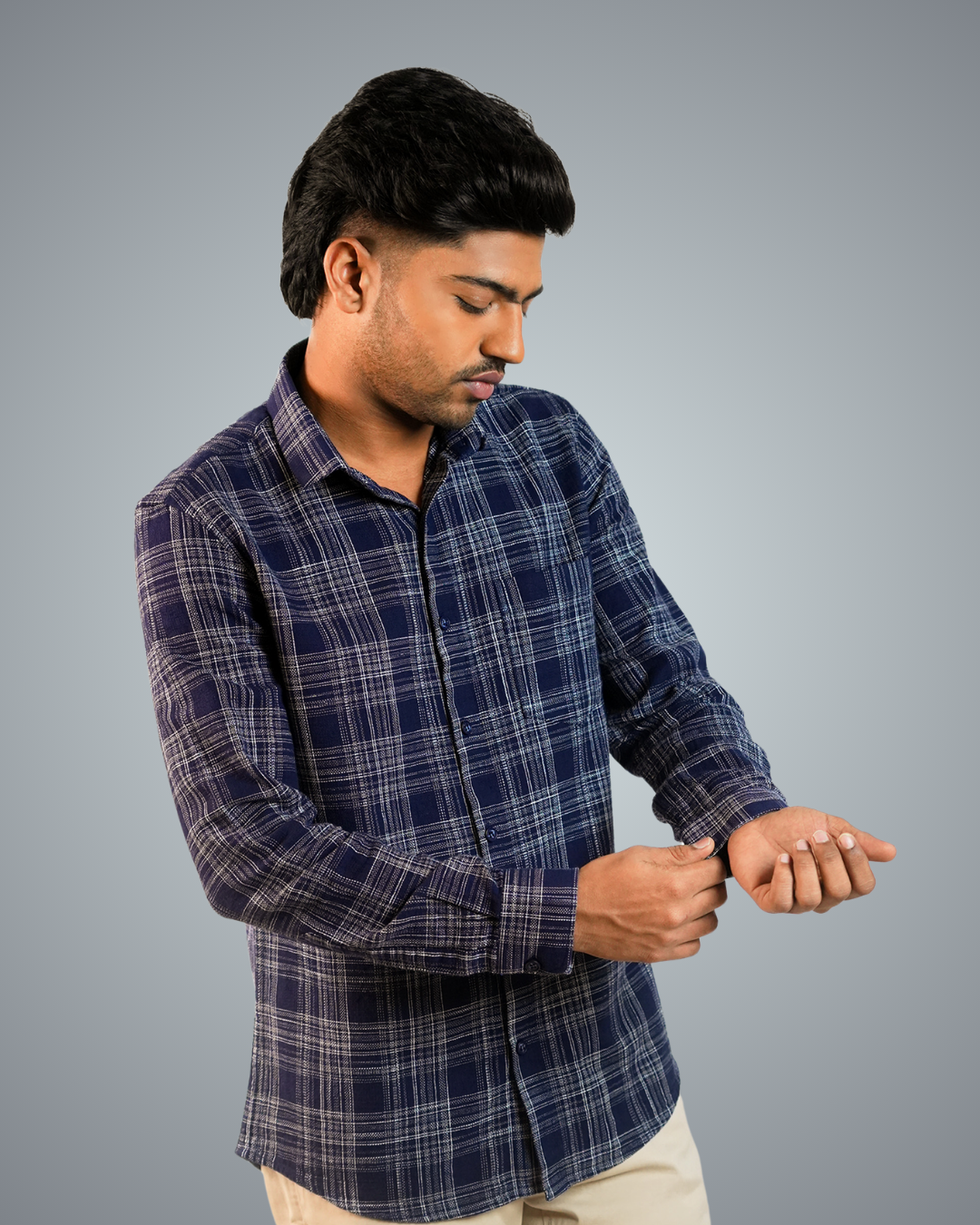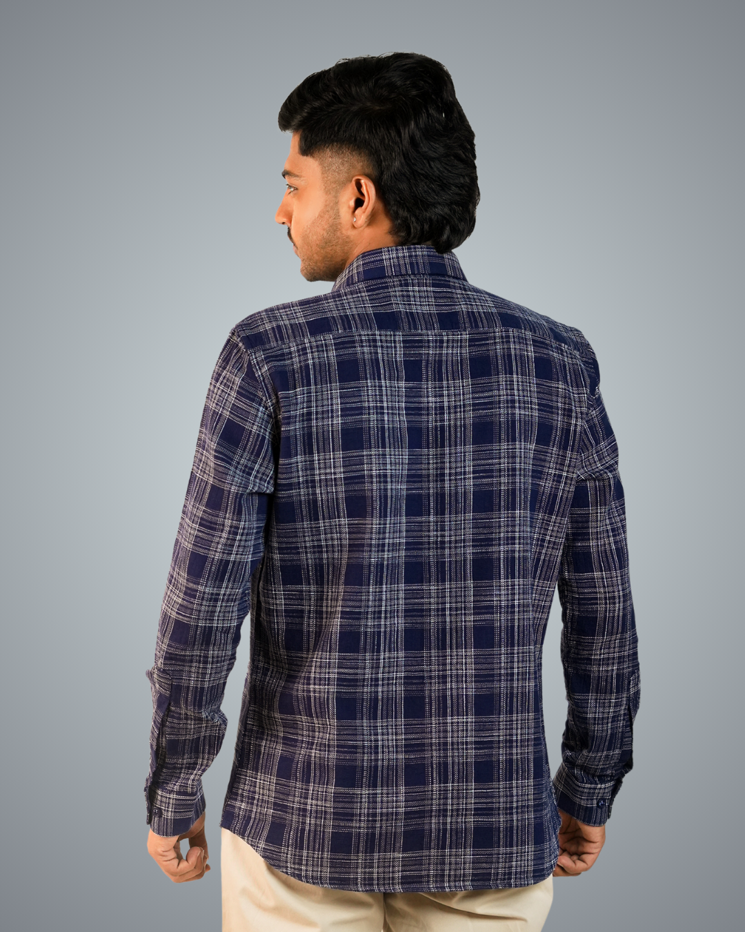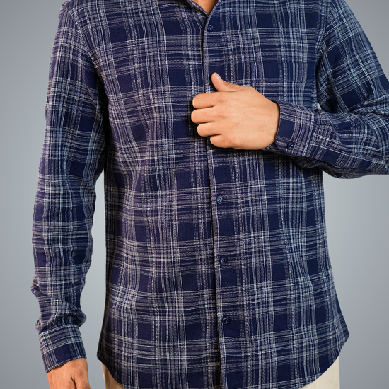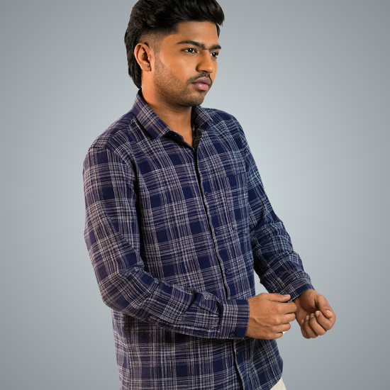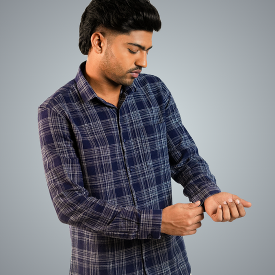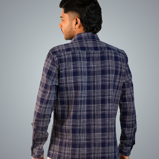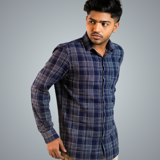 Pair the blue-dotted checks shirt with slim-fit jeans or chinos, roll up the sleeves, and leave the top button undone. Complete the look with white sneakers or loafers for a relaxed, stylish vibe.