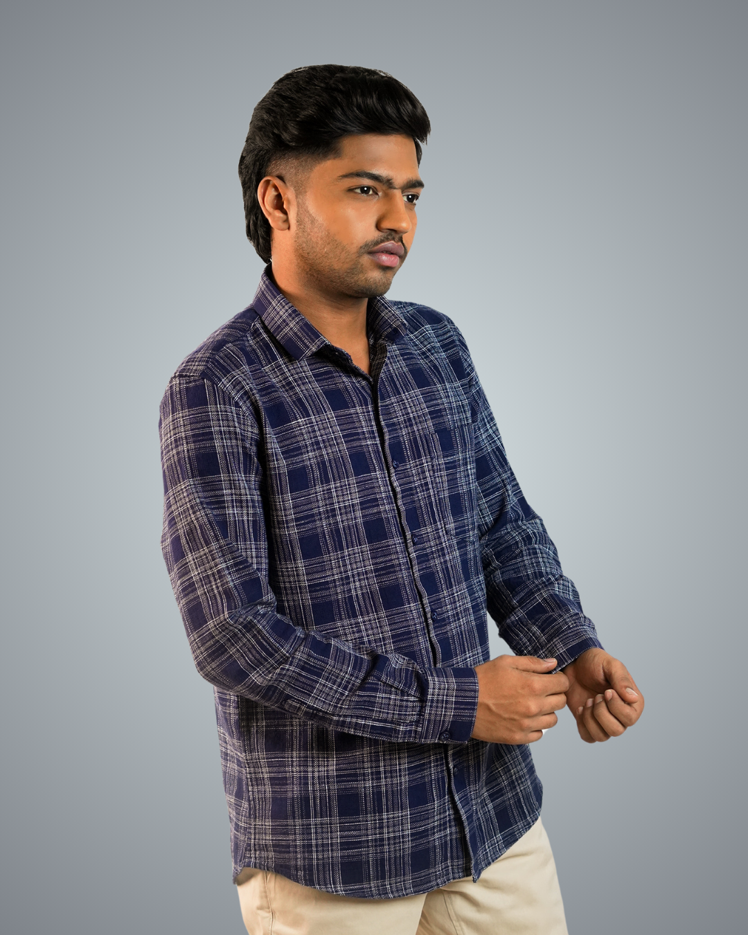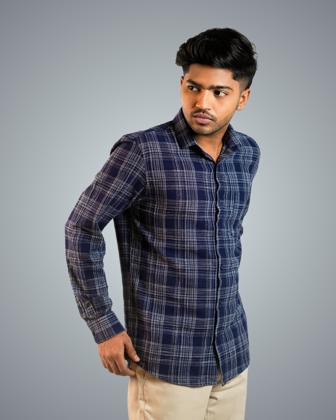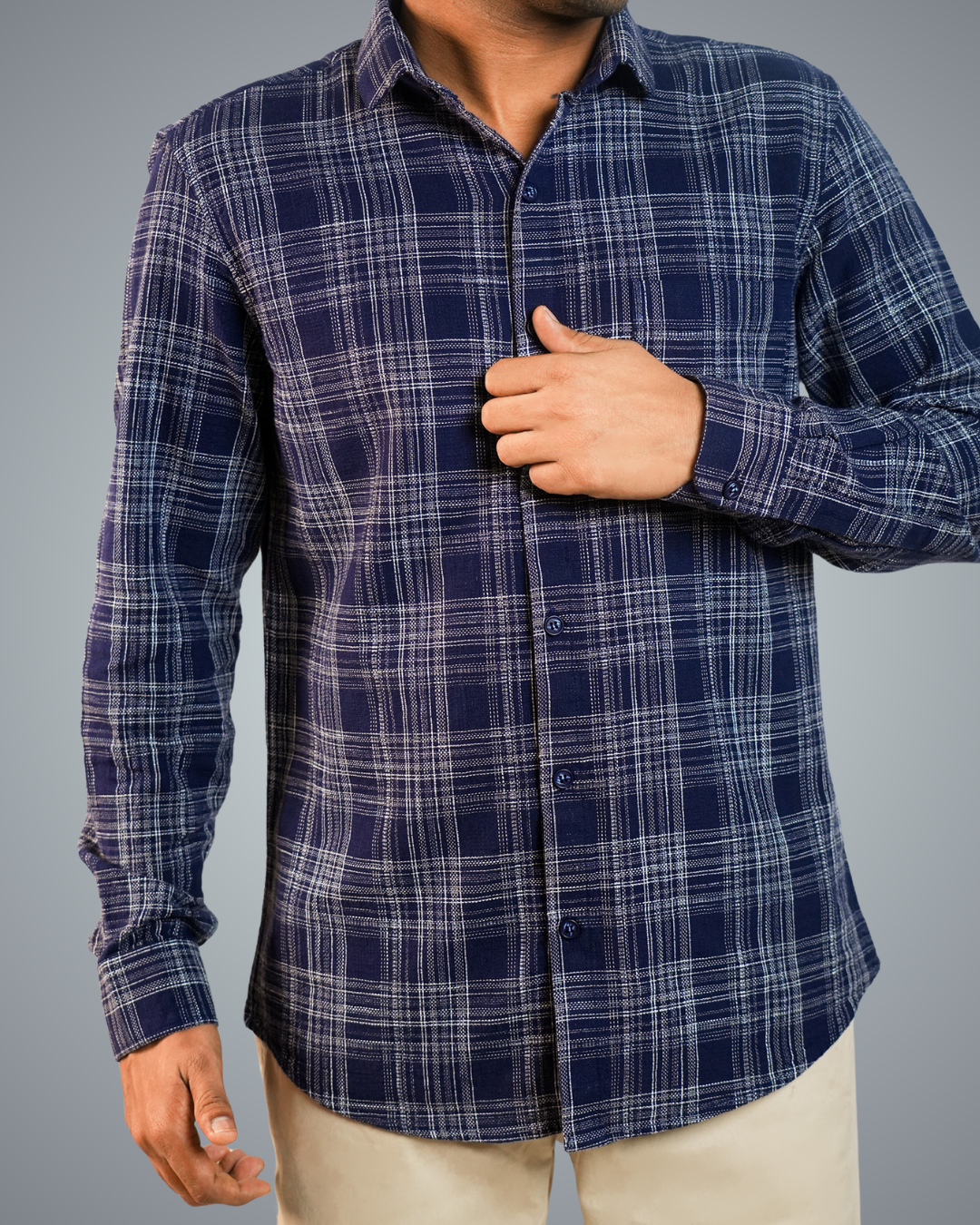 Pair the blue-dotted checks shirt with slim-fit jeans or chinos, roll up the sleeves, and leave the top button undone. Complete the look with white sneakers or loafers for a relaxed, stylish vibe.