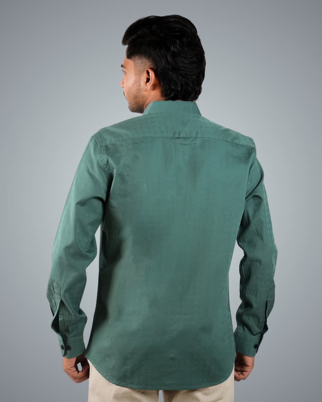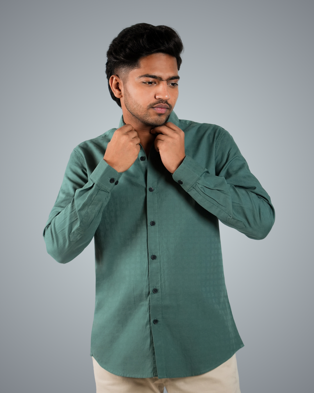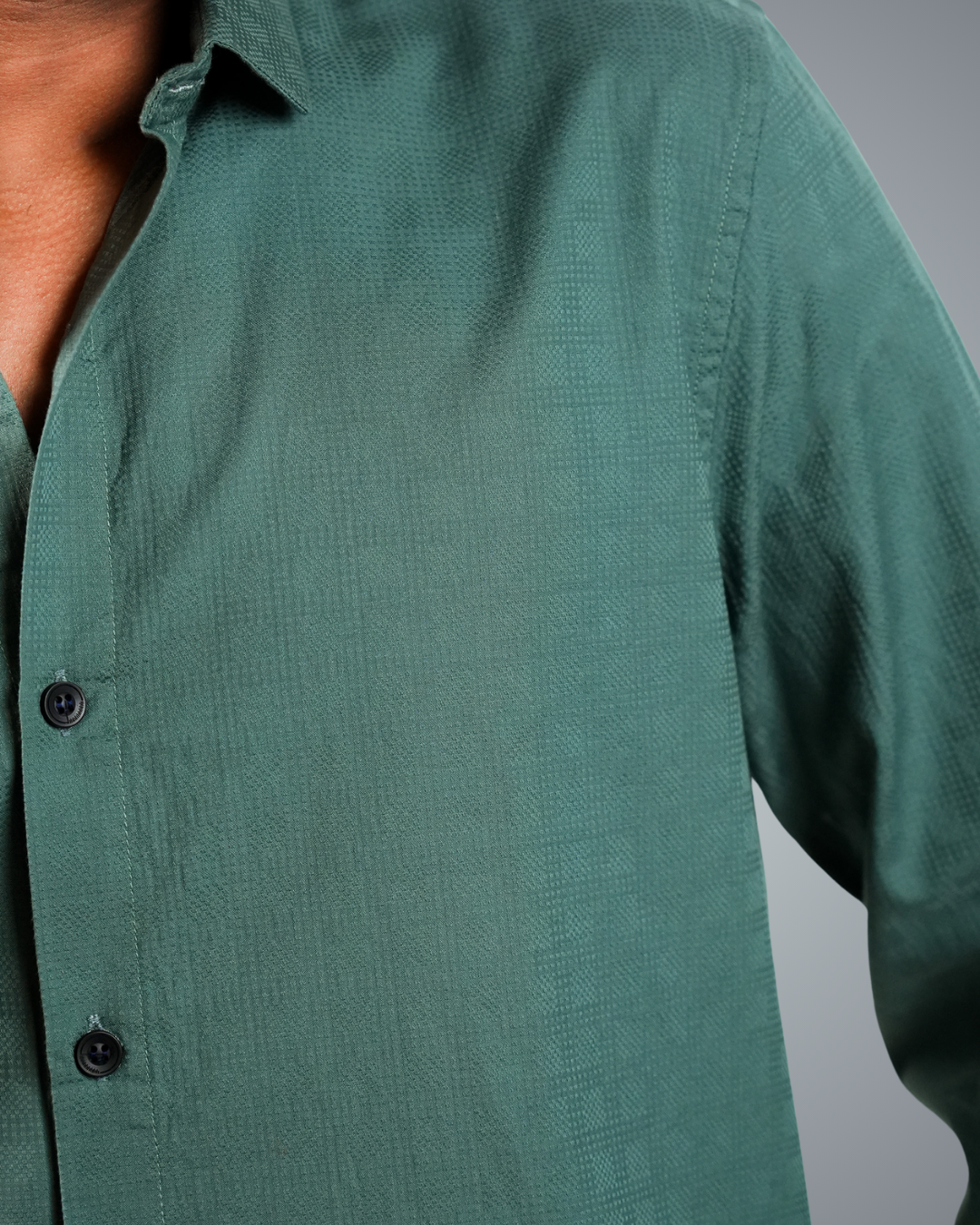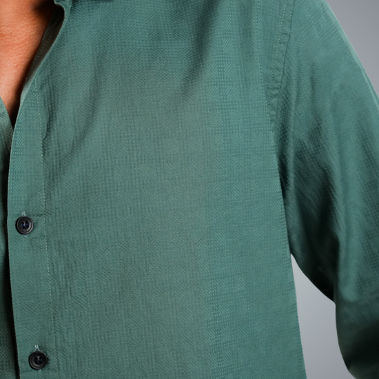 For a refined formal party look, pair this bottle green structured shirt with charcoal grey or black tailored trousers. Elevate the ensemble with a sleek black belt and polished leather loafers. Add a fitted blazer or a textured suit jacket for a sophisticated finish!