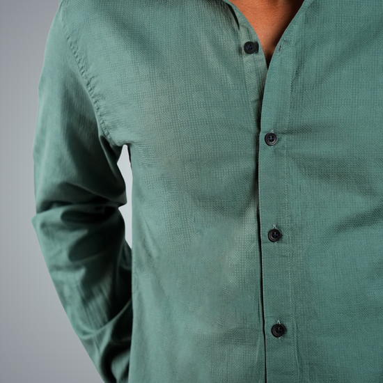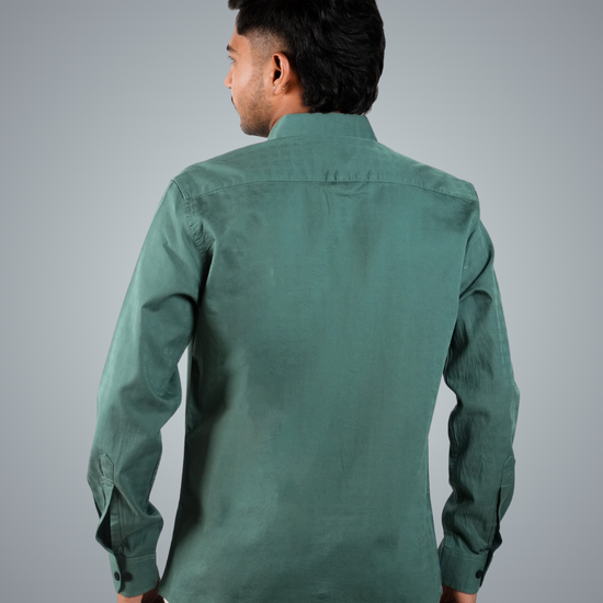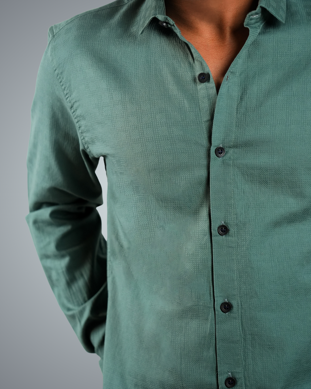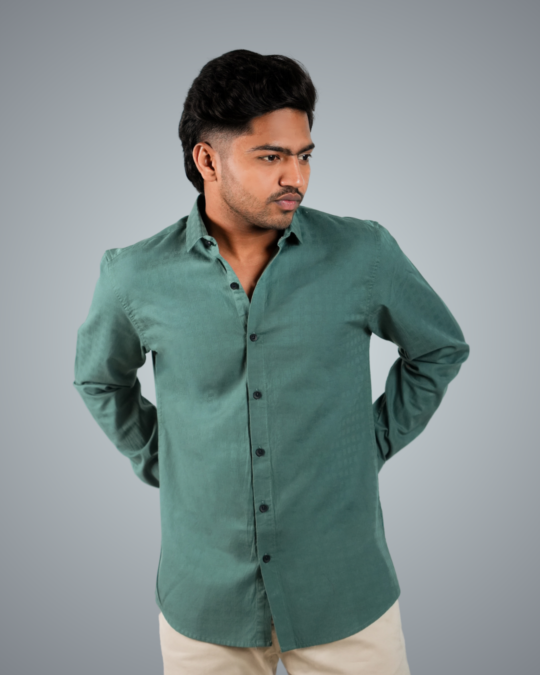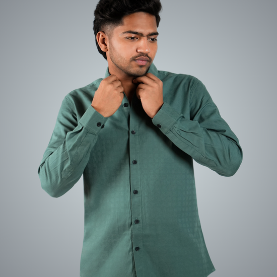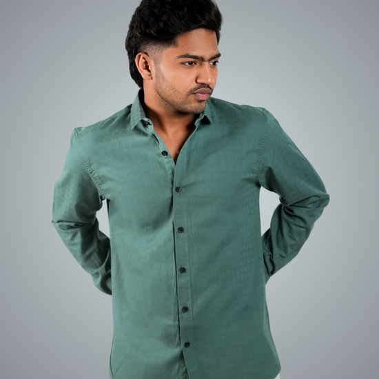 For a refined formal party look, pair this bottle green structured shirt with charcoal grey or black tailored trousers. Elevate the ensemble with a sleek black belt and polished leather loafers. Add a fitted blazer or a textured suit jacket for a sophisticated finish!