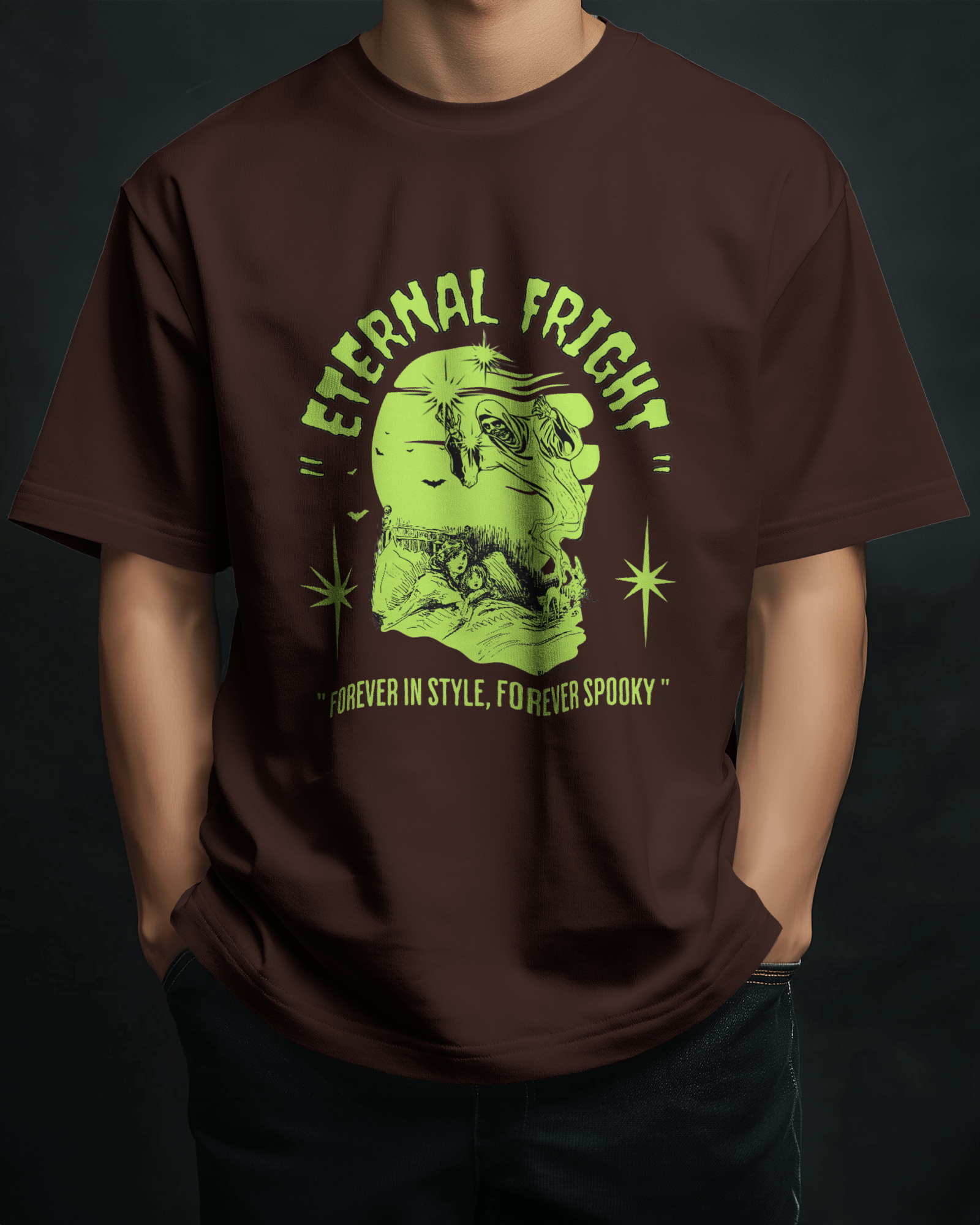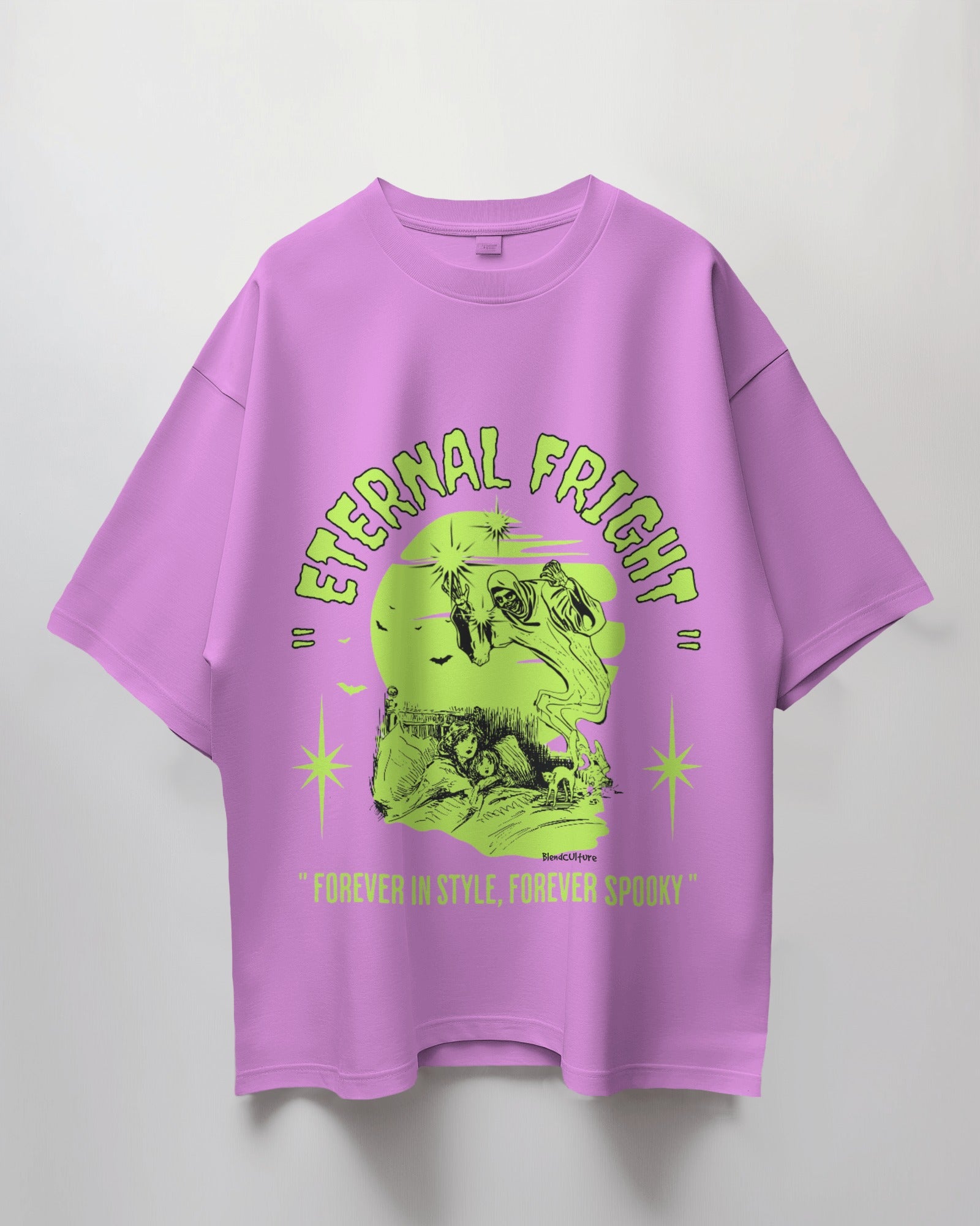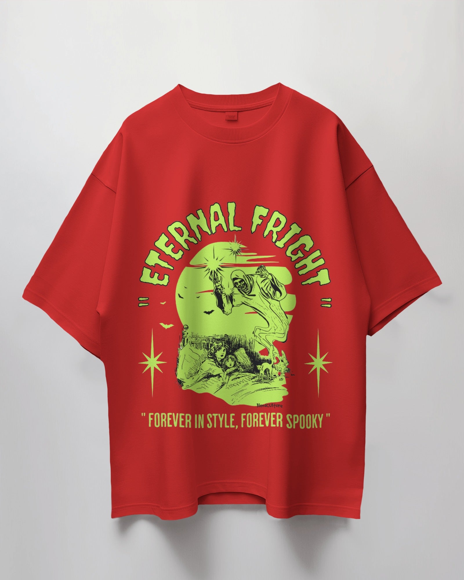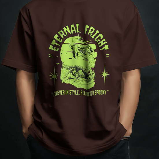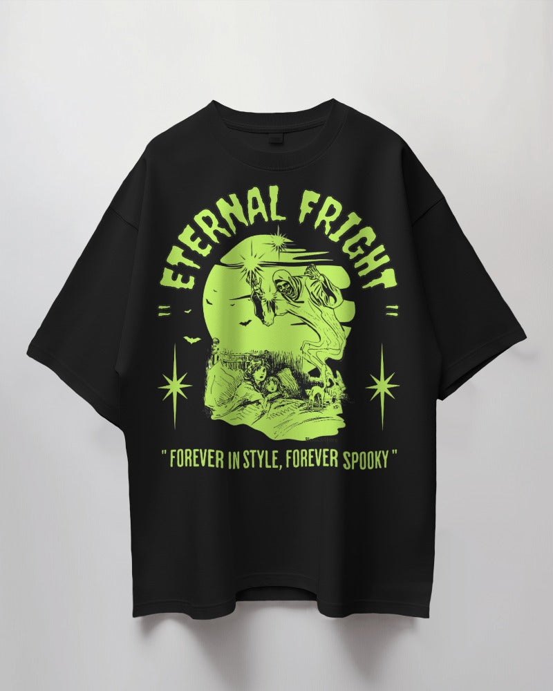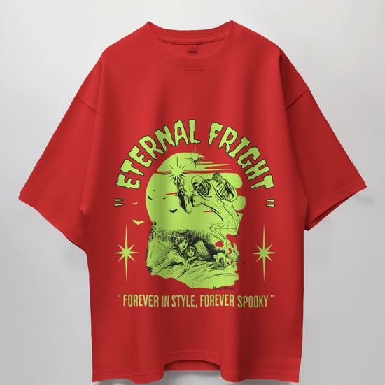 The classic Eternal Fright Oversized t-shirt is a versatile staple, crafted from soft, breathable fabric with 180 GSM 100% Cotton. Its striking graphic design adds a touch of seasonal flair, making it perfect for everything from casual hangouts to festive gatherings.