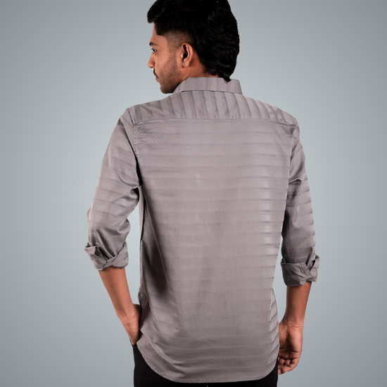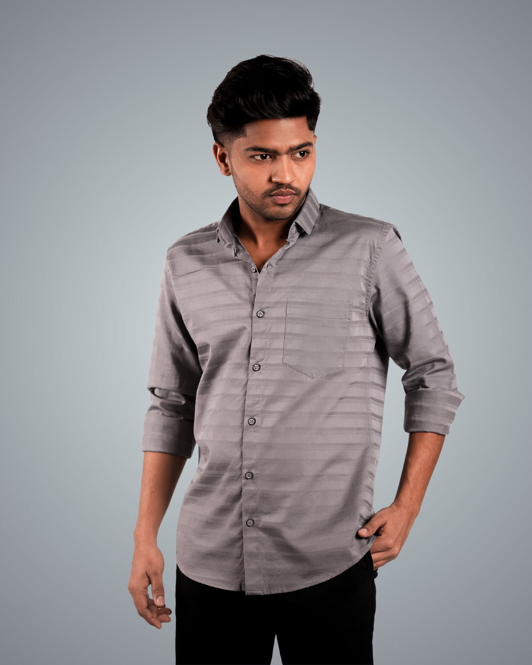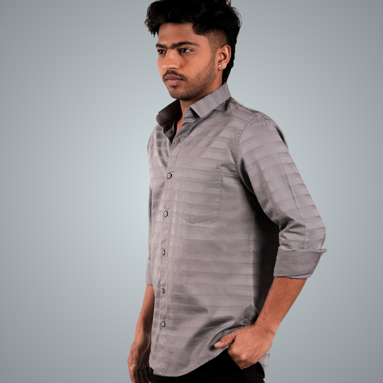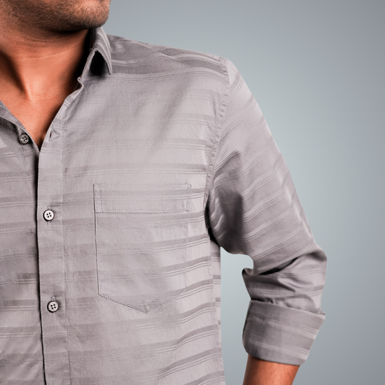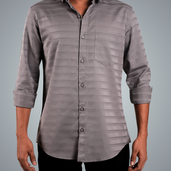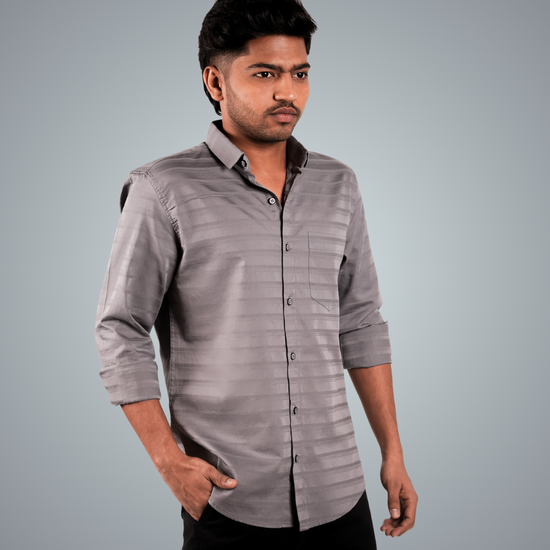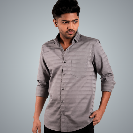 Elevate your style with the Grey Uneven Stripe Regular Fit Shirt, perfect for both casual and formal occasions. Made from 100% premium cotton, it offers superior comfort and breathability for all-day wear. Featuring a unique uneven stripe pattern in grey, this versatile shirt adds a modern and sophisticated touch to your wardrobe.