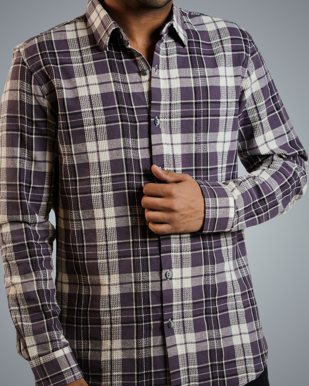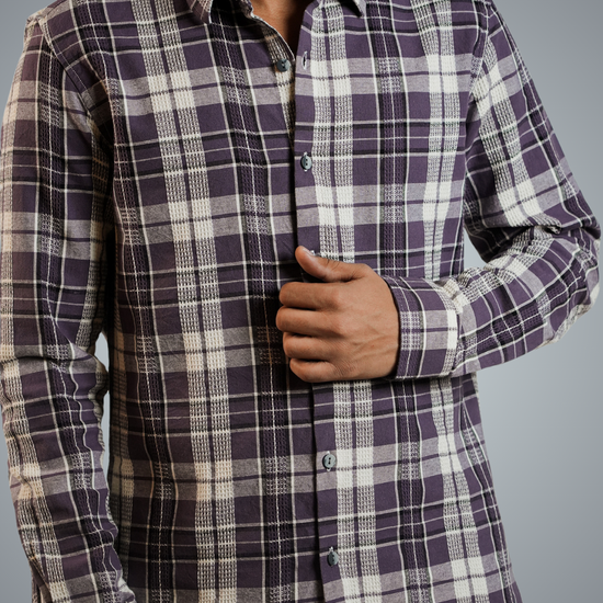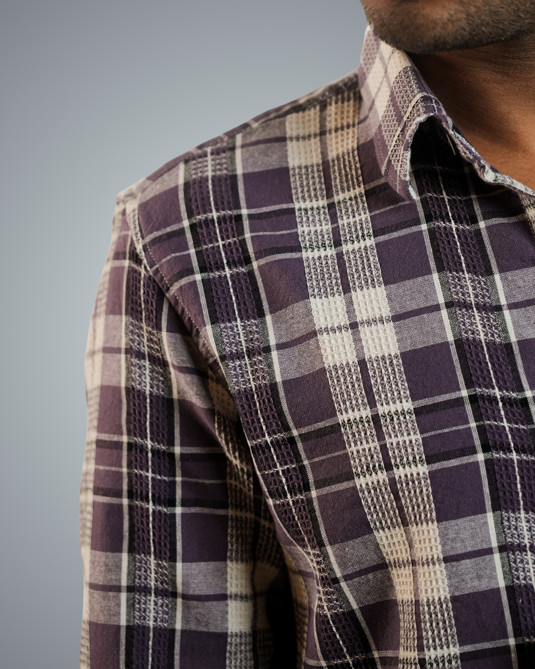 Keep it effortlessly cool by pairing this purple brushed checks regular-fit shirt with light-wash denim or beige chinos. Roll up the sleeves for a relaxed vibe and complete the look with white sneakers or brown loafers for a stylish, casual appeal!