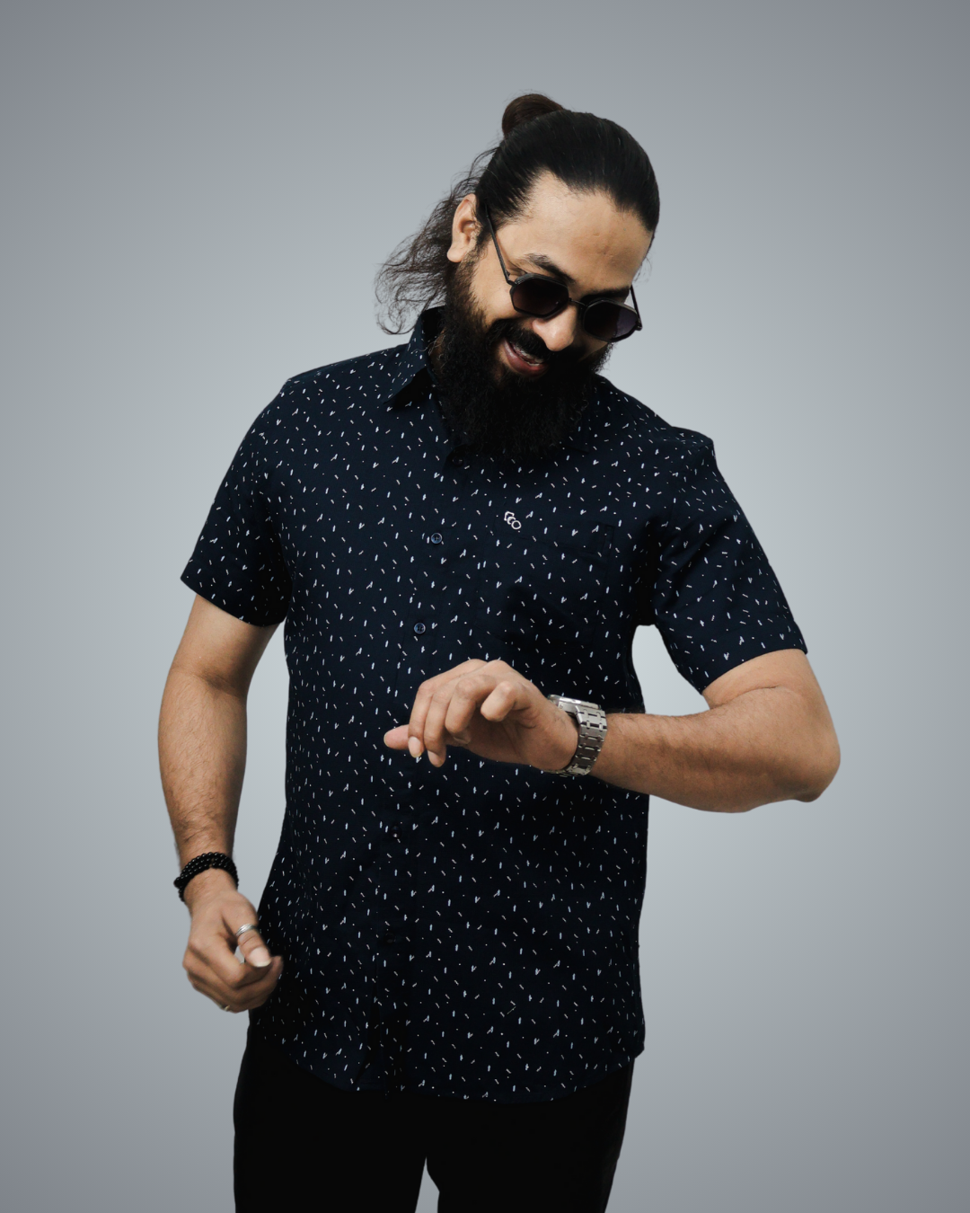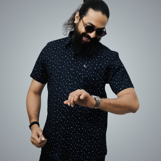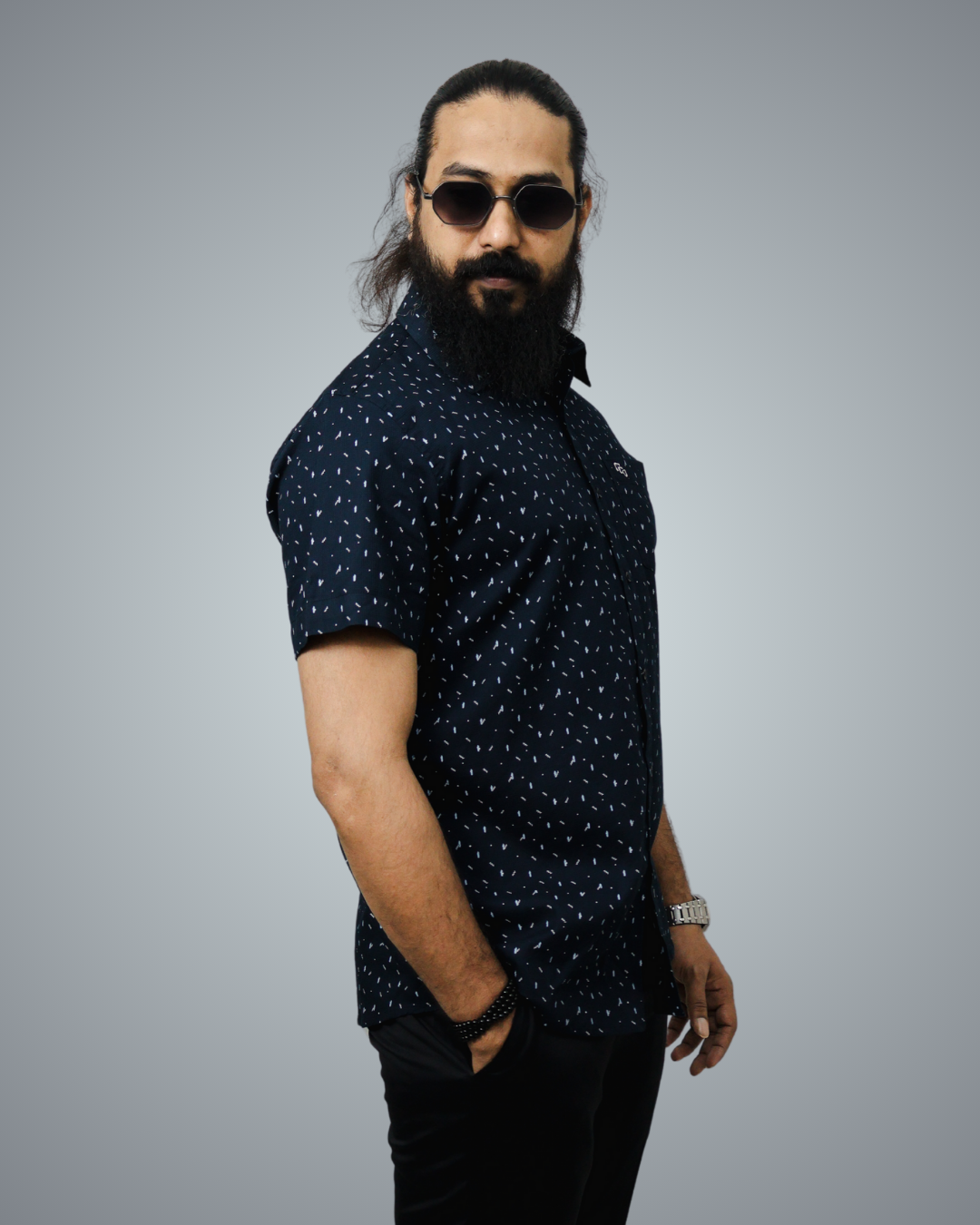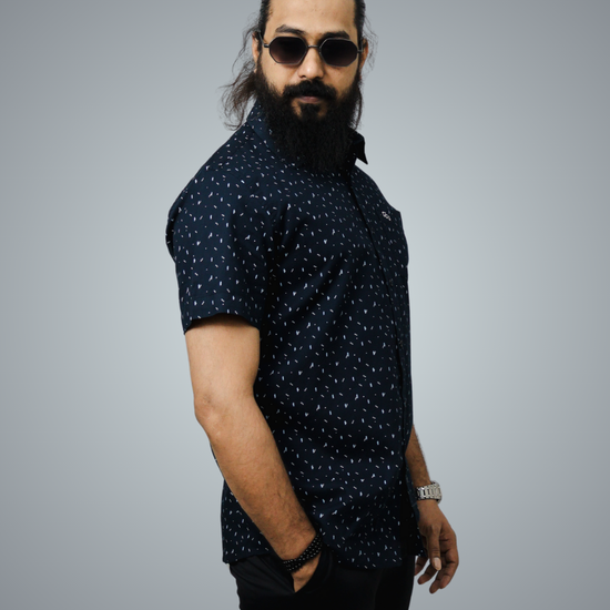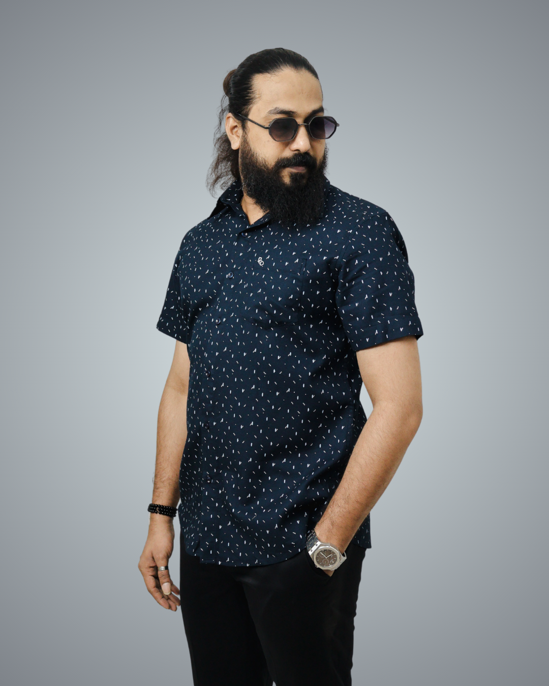 Pair this navy blue dotted shirt with well-fitted beige or white chinos for a classy yet casual look. Opt for brown or navy loafers to keep it polished. A sleek silver or leather-strapped watch adds sophistication. Roll up the sleeves slightly for a relaxed touch, and consider aviators or round sunglasses for a stylish finish.