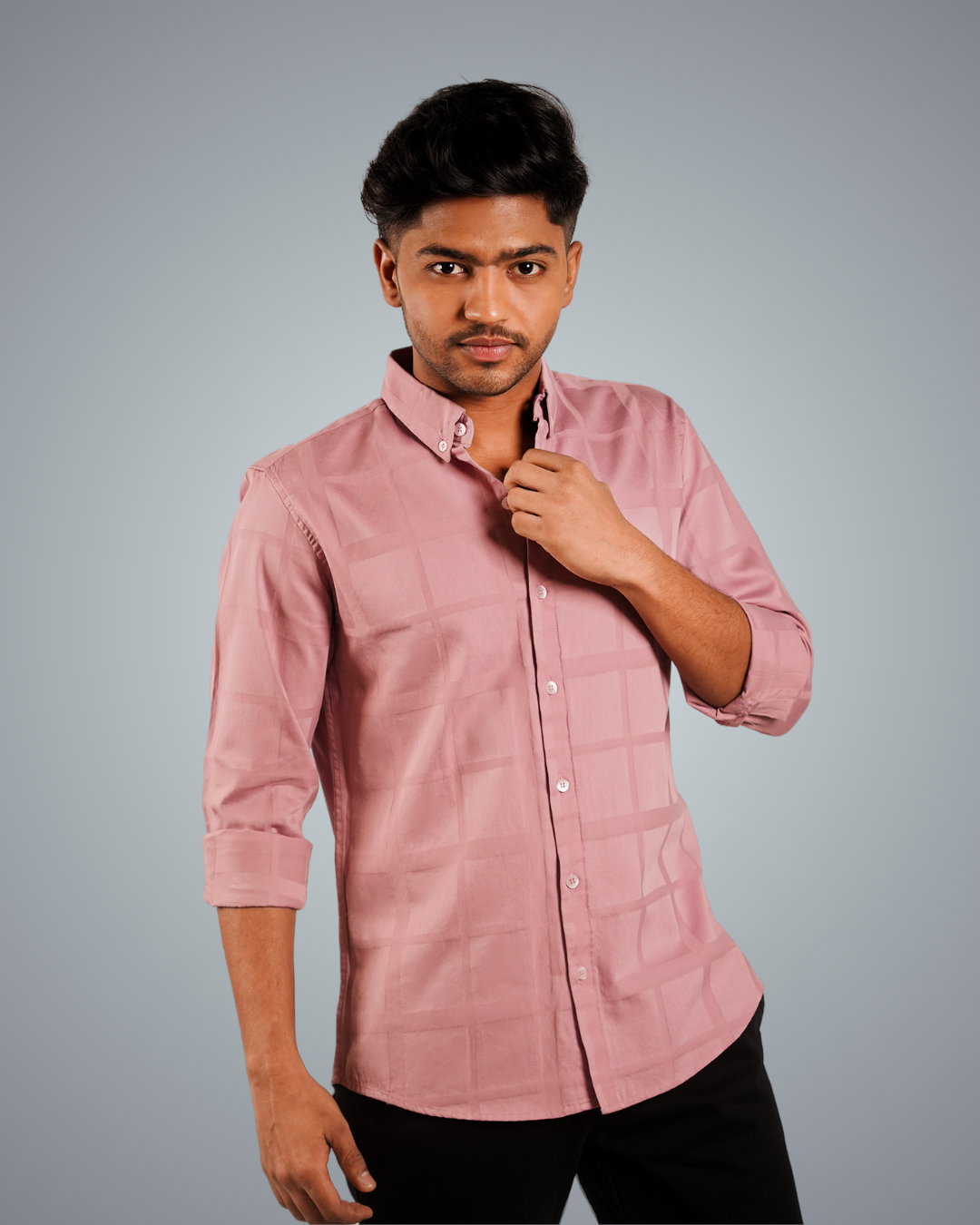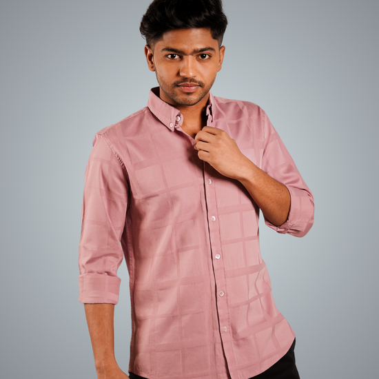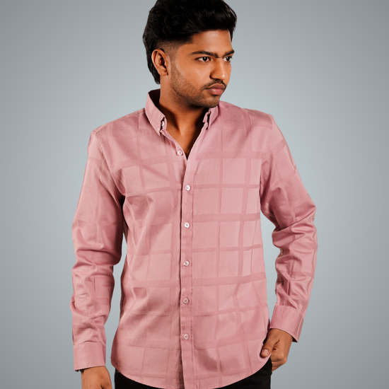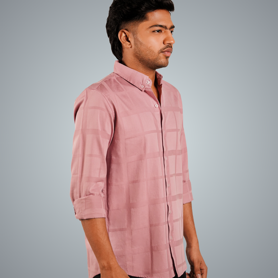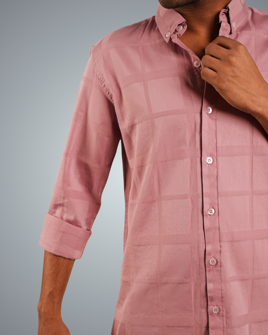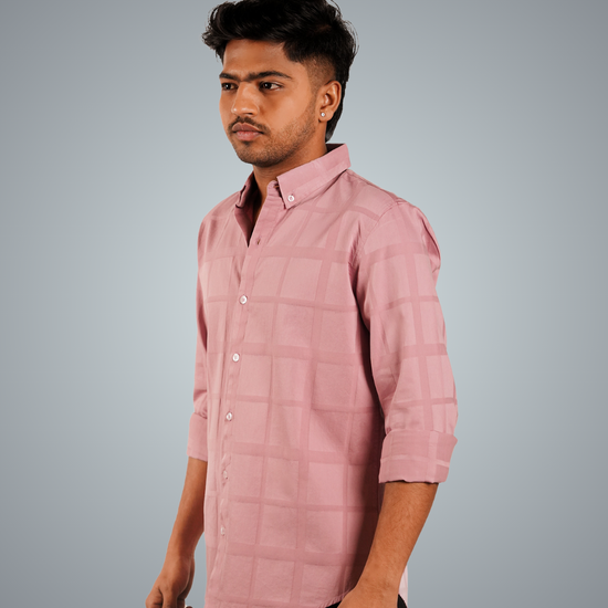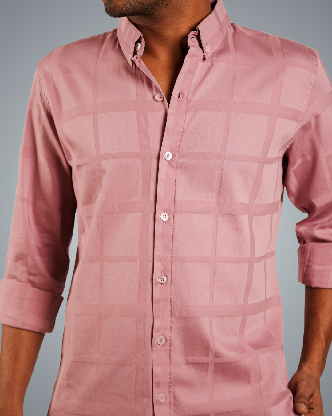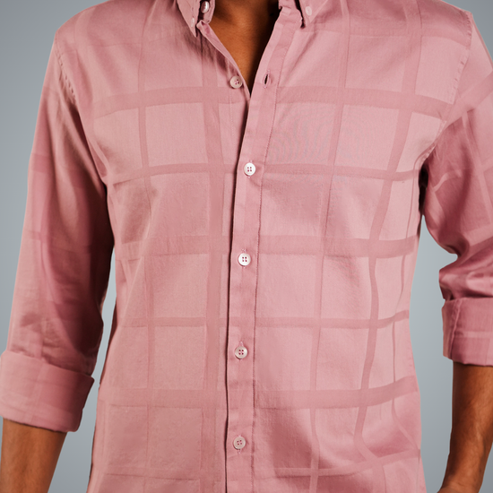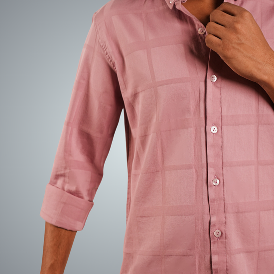Elevate your formal look by pairing this rose gold checkered shirt with tailored charcoal grey or navy blue trousers. Tuck it in neatly and complement the outfit with a sleek black or brown leather belt and matching oxford shoes. Add a structured blazer for a refined, boardroom-ready finish!
