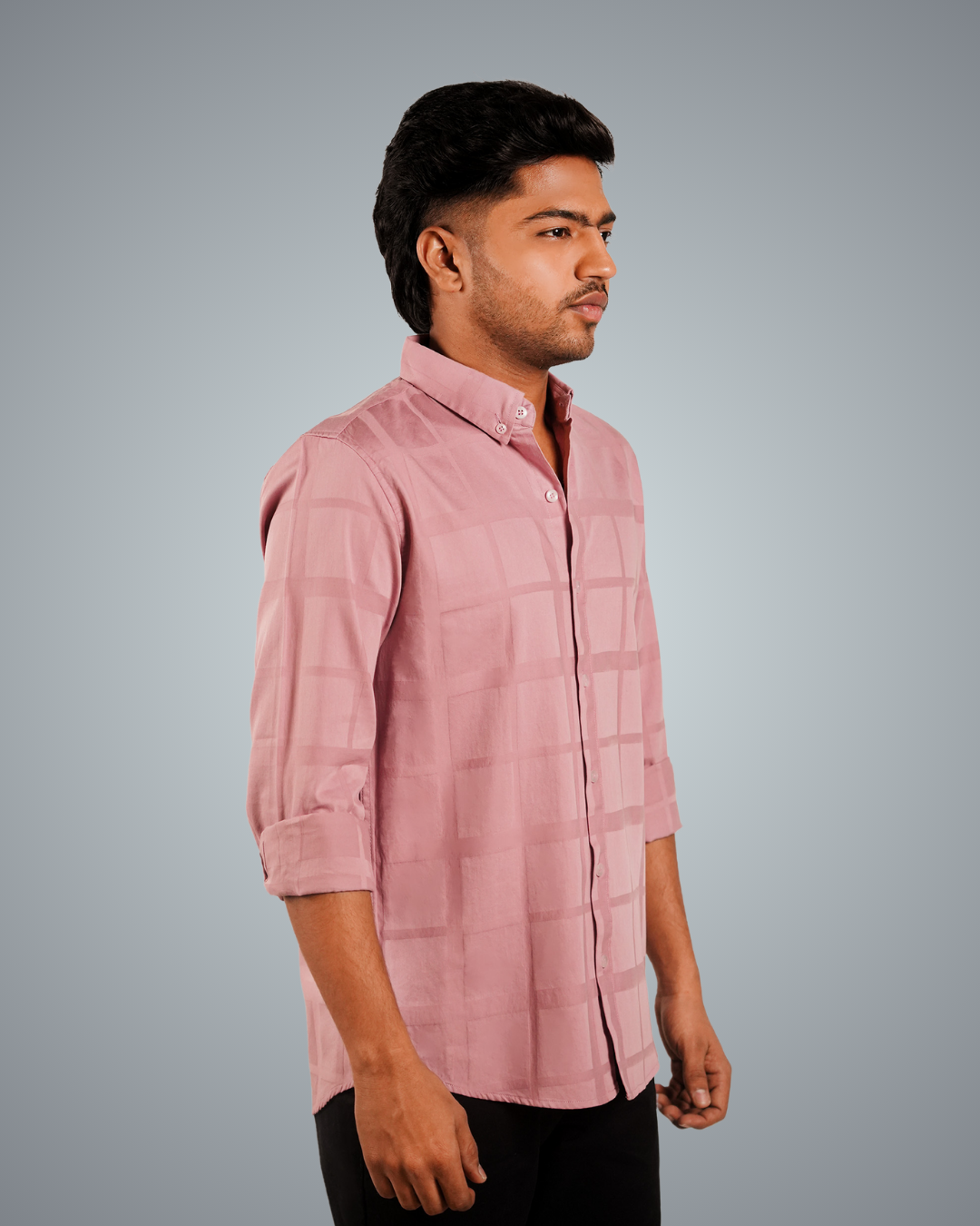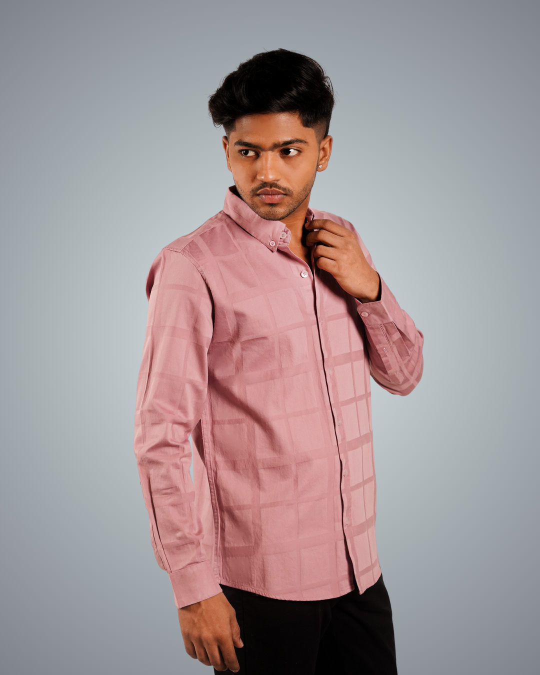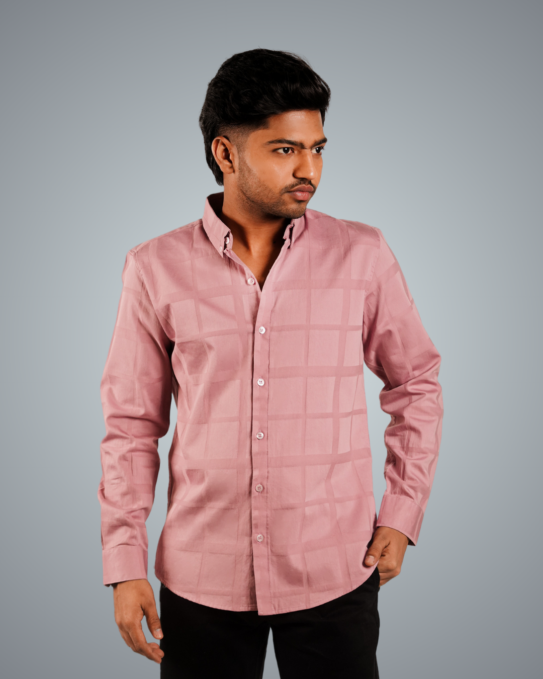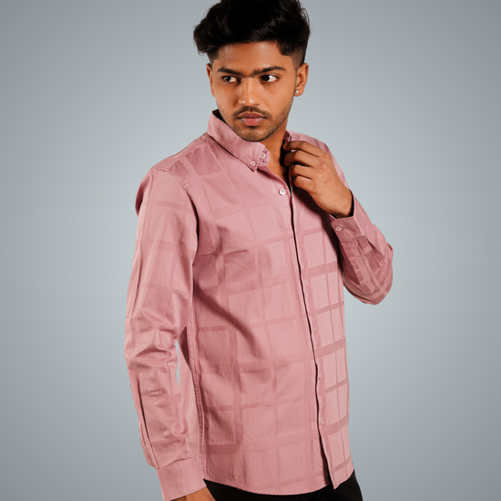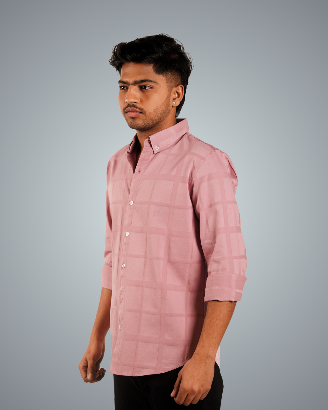 Elevate your formal look by pairing this rose gold checkered shirt with tailored charcoal grey or navy blue trousers. Tuck it in neatly and complement the outfit with a sleek black or brown leather belt and matching oxford shoes. Add a structured blazer for a refined, boardroom-ready finish!